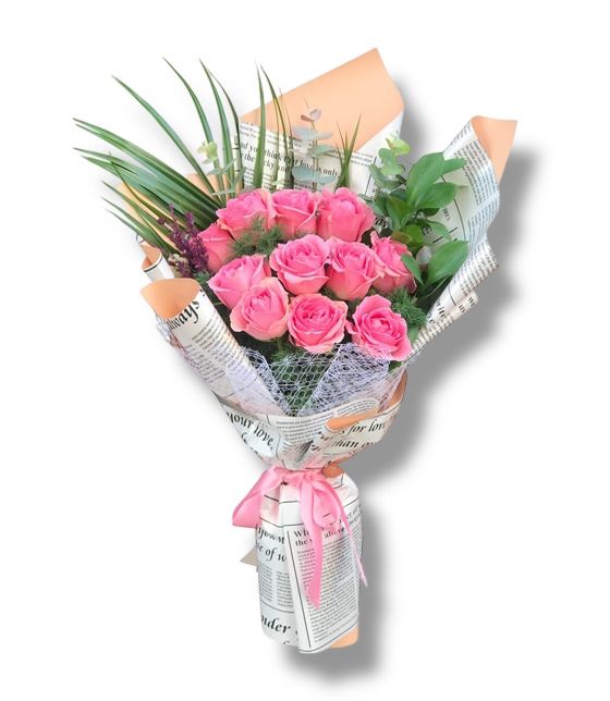 Gazete kağıdı görünümlü buket kağıdında feniks yaprağı, okaliptus ve lavanta ile hazırlanan 11 adet pembe gül buketi