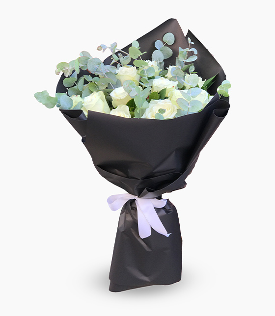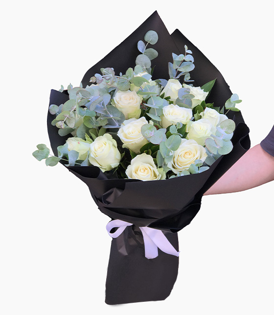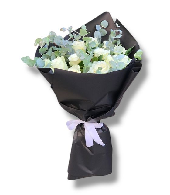 Siyah fonlu okaliptus yeşillikleri ile hazırlanan 15 adet beyaz gül buketi