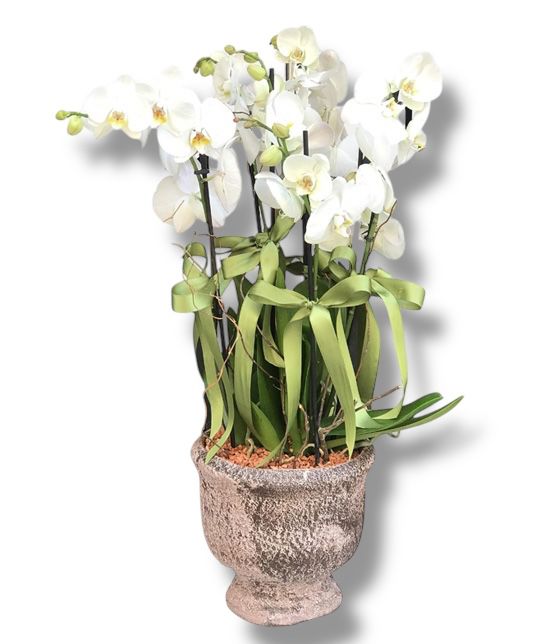 Dekoratif saksıda 6 dallı beyaz orkide çiçekleri.Stok durumuna göre saksı farklı olabilir!