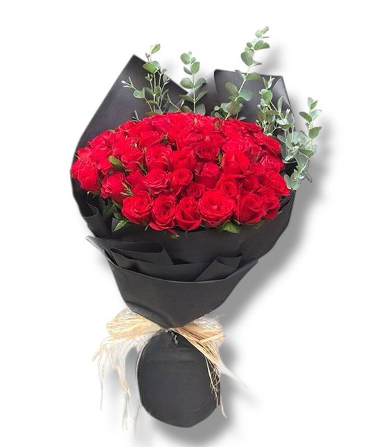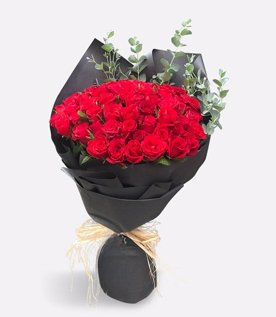 Siyah fonlu kağıt ile dizaynı yapılan 60 adet kırmızı gül ve okaliptus yeşillikleri ile hazırlanan kırmızı gül buketi Kırmızı Gül : 60 Adet