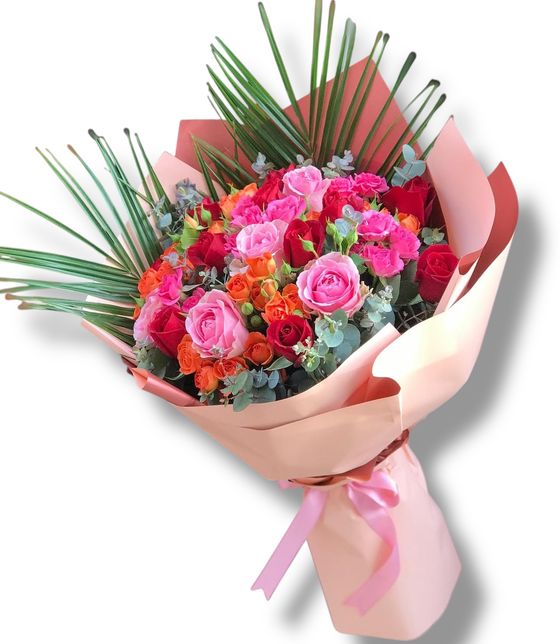 Dekoratif feniks yaprakları ,okaliptus ve renkli ithal güller ile hazırlanan renkli gül buketi