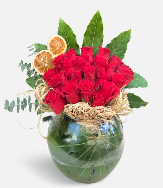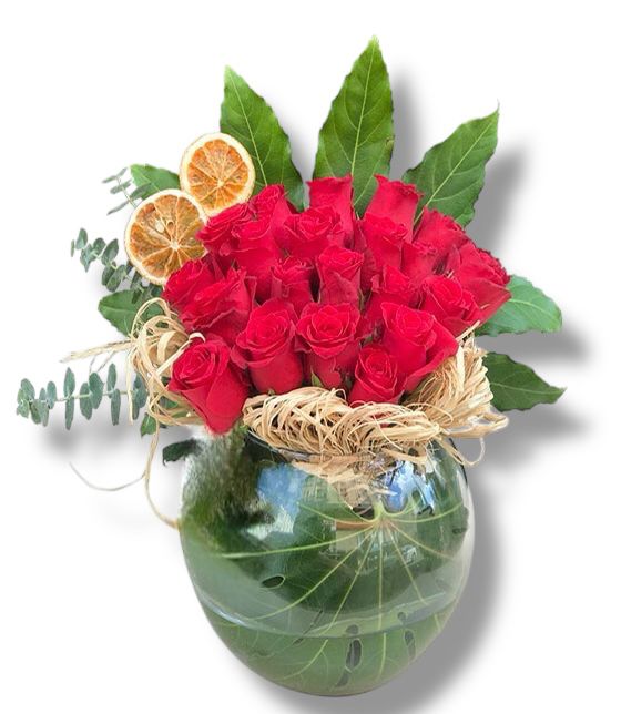 Akvayum fanusta dekoratif yeşil yapraklar, kuru çiçekler ile hazırlanan 21 adet kırmızı gül