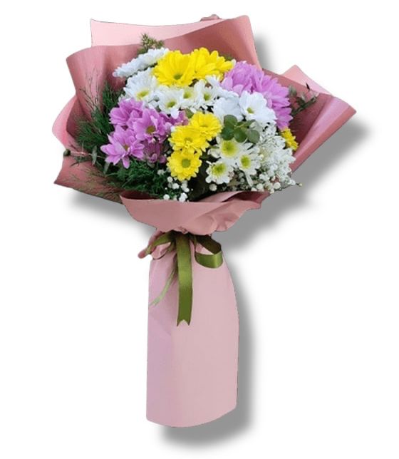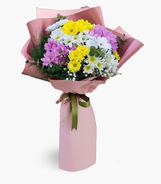 Sarı, beyaz ve pembe papatya çiçekleri ile hazırlanan karışık renkli papatya buketi