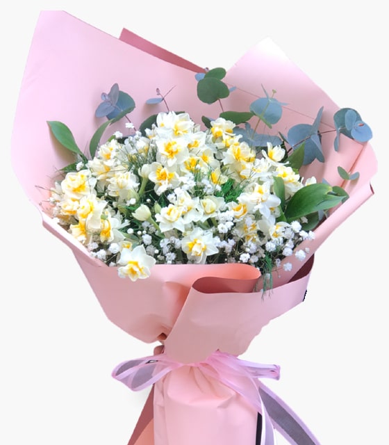 Okaliptus yeşillikleri ve cipsofilyalar ile hazırlanan 20 dal kokulu nergis çiçeği