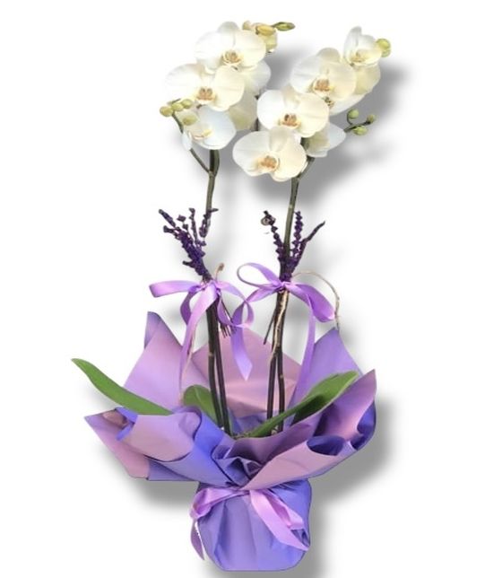 Lavantalar ile hazırlanan iki dallı beyaz orkide çiçeği