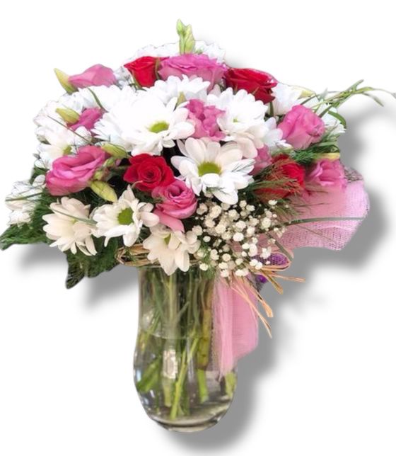 Cam vazosunda hazırlanmış papatya,lisyantus ve güller... Yaklaşık ürün yüksekliği 35 cm dir.