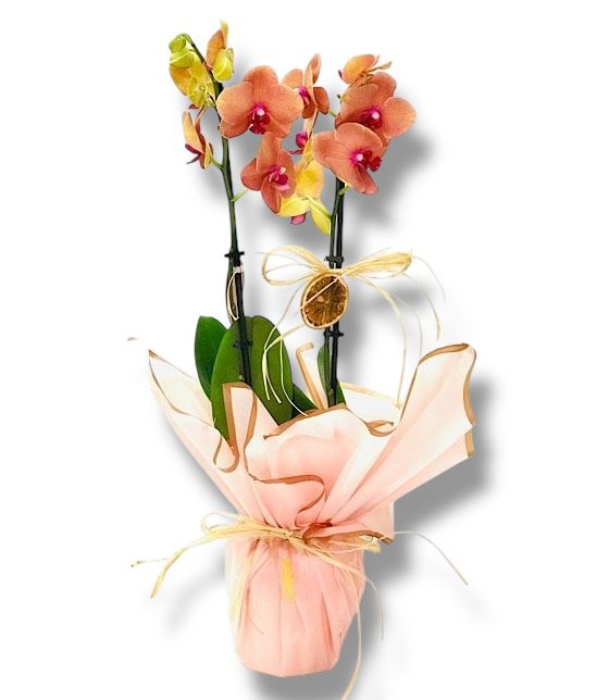 İki dallı pembe fon ve dekoratif aksesuarlar ile tasarımı yapılan iki dallı Ateş renkli Orkide çiçeği
