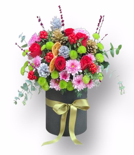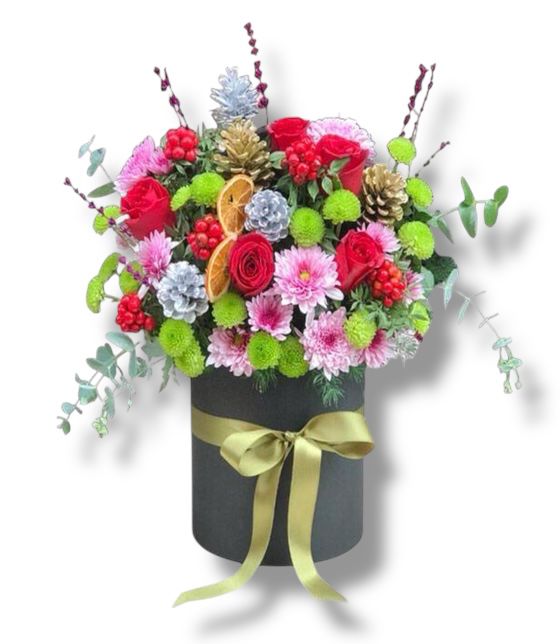 kokina veyeni yıl süslemeleri ile hazırlanan kutuda yeni yıl aranjmanı