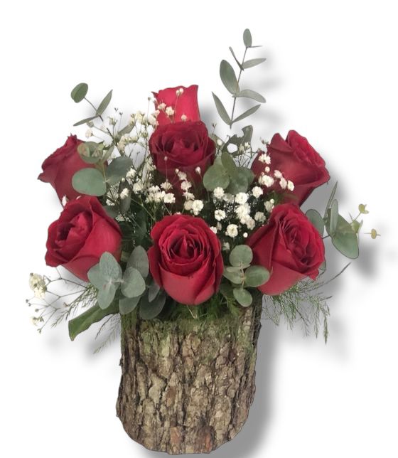 Doğal Ahşap Kütükte 7 Adet Kırmızı Gül