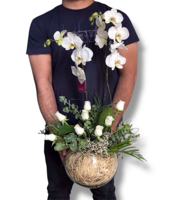 Büyük akvaryum vazosunda,ithal çift dal beyaz orkide ve 10 adet beyaz gül.